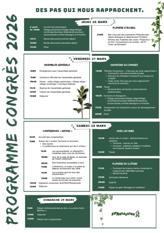 Publié le 23 mars 2026Congrès de la FFRandonnée 2026 à Brest - 26-29 mars