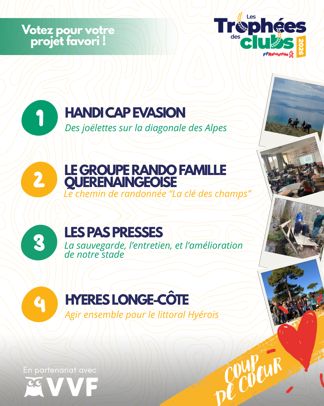 Le coup de cœur du public recevra son trophée lors de l'Assemblée Générale 2026 de la FFRandonnée. Parmi les nombreux candidats aux Trophées des Clubs, quatre ont déjà été choisis comme lauréats de leur catégorie (environnement, jeunesse, inclusion, rencontres sportives) par un jury fédéral, et seront également récompensés à cette occasion.