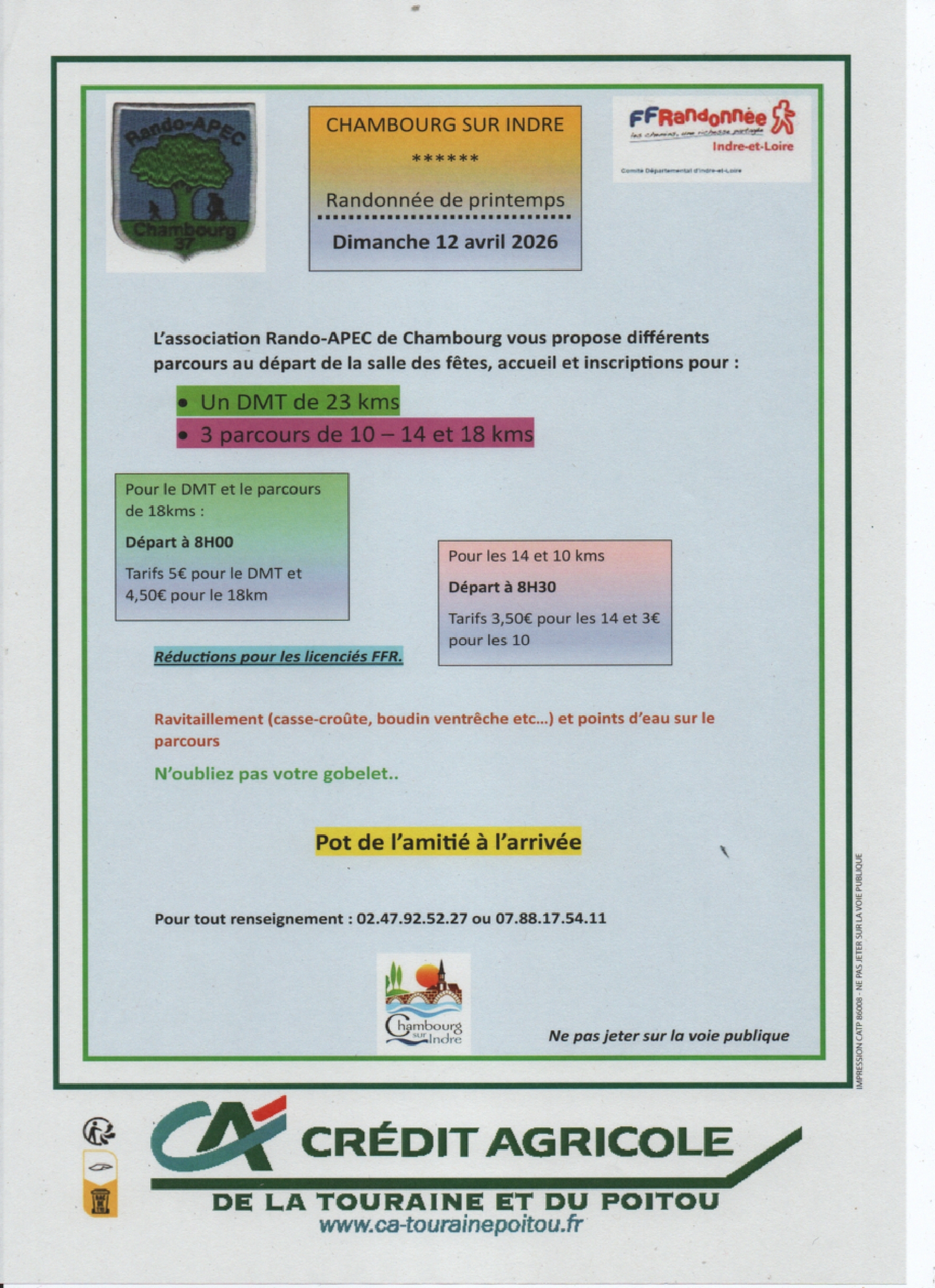 Ravitaillement (casse-croûte, boudin ventrêche) et 2 points d’eau pour les 22 et 18 km. Verre de l'amitié. Chien tenu en laisse courte admis.