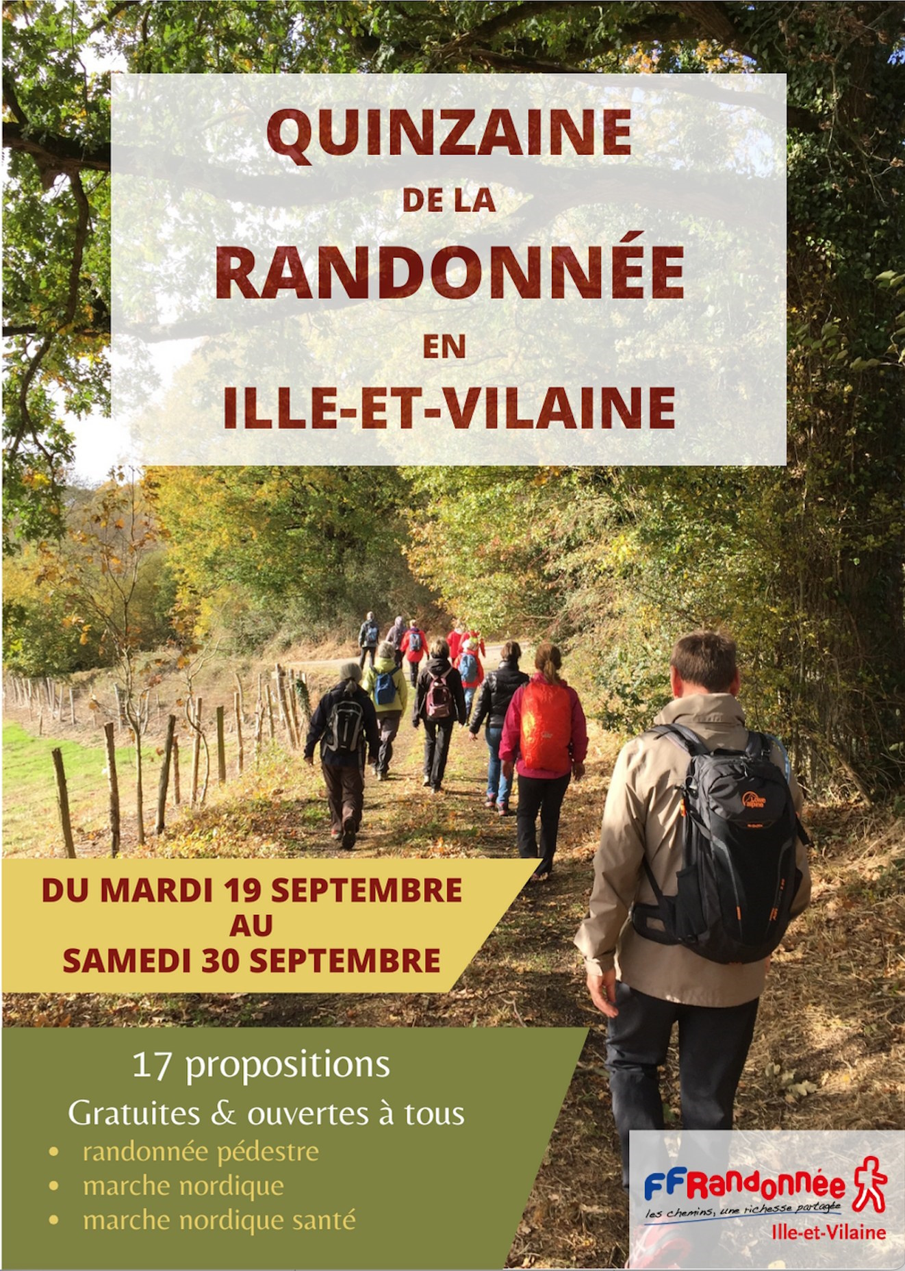 La Quinzaine de la rando en Ille-et-Vilaine propose pas moins de 17 propositions de randonnée gratuites et ouvertes à tous .
