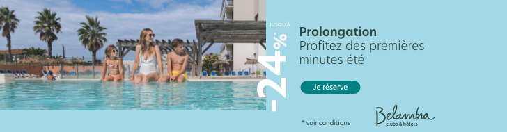 AzurevaVoyage12% toute l’année cumulable avec nos promotionsAzureva regroupe 33 villages et résidences de vacances en France. Bretagne, Pays basque, Savoie, Auvergne, Provence et bien d’autres…BelambraVoyage-5% à -24% sur l’ensemble des séjoursBelambra clubs, n° 1 des clubs de vacances en France avec 45 clubs et hôtels situées dans les plus beaux endroits de France.
